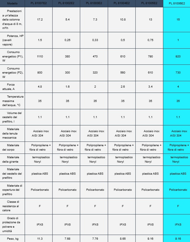 - Corpo/turbina/cestello/coperchio: PP + Fibra di vetro/Noryl® + Fibra di vetro/ABS/Policarbonato
