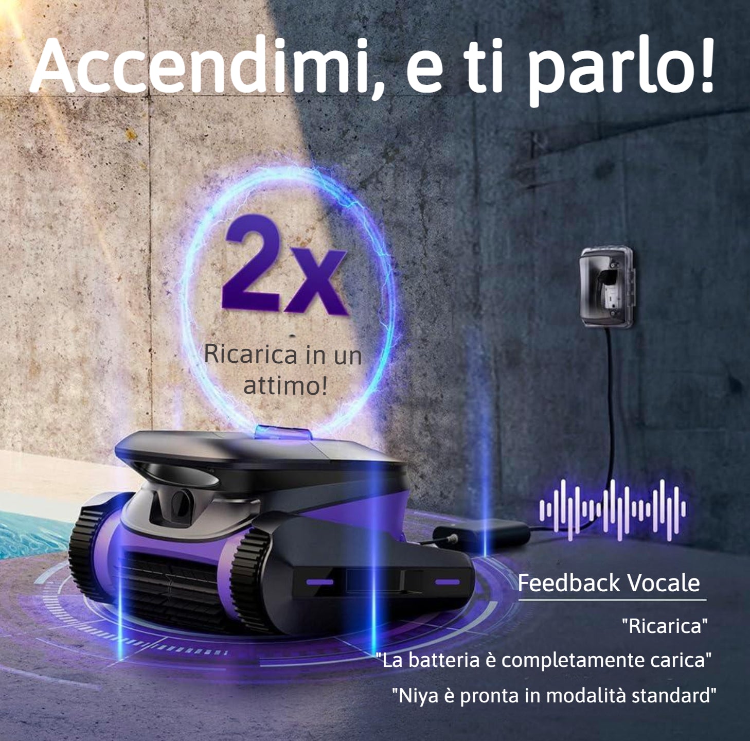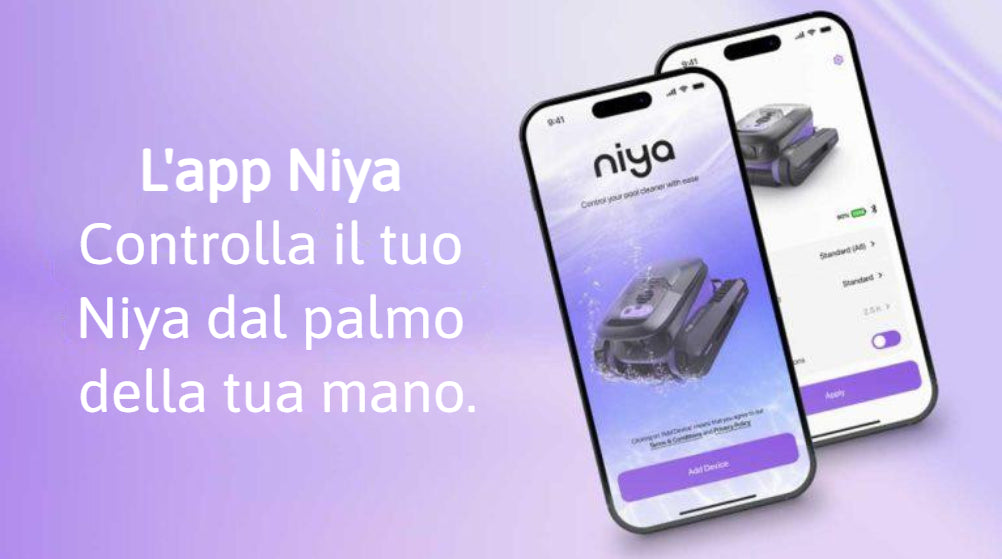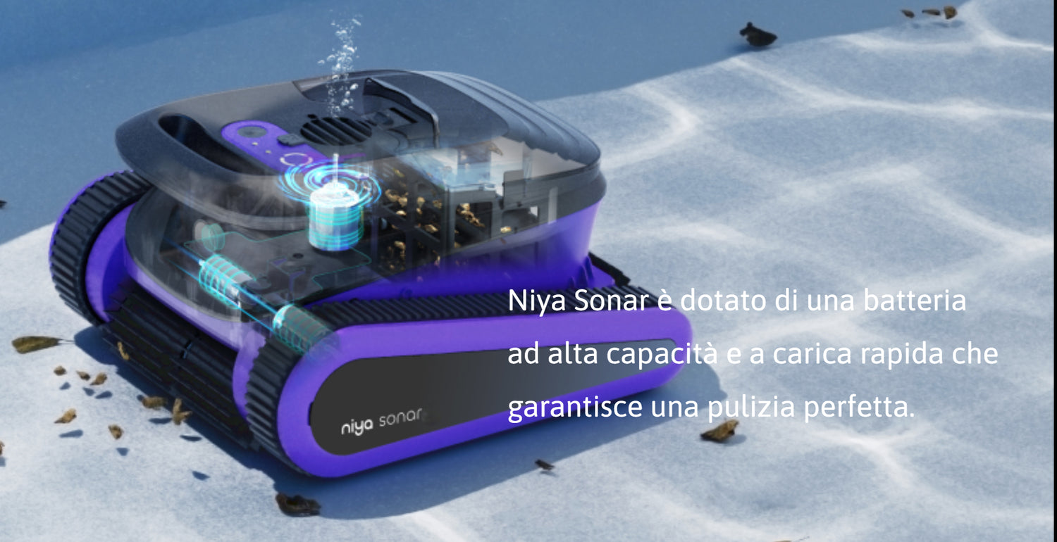 Scopri Niya, la nuova generazione di robot pulitori a batteria firmata Maytronics. Dotati di tecnologia Sonar avanzata, i robot Niya offrono una pulizia intelligente e autonoma, senza cavi né limiti. Grazie al design compatto e all’innovativo sistema di navigazione, assicurano un fondo, pareti e linea d’acqua impeccabili, con massima efficienza e semplicità d’uso.