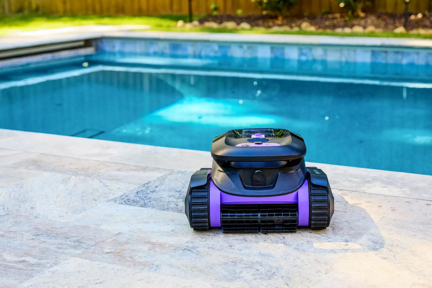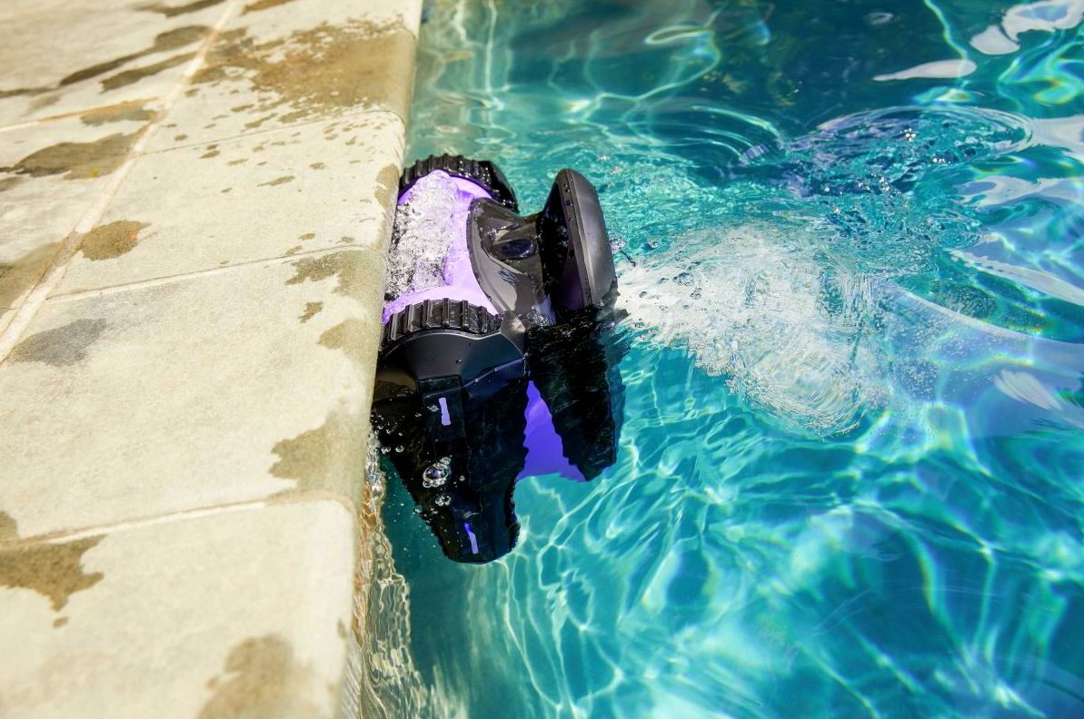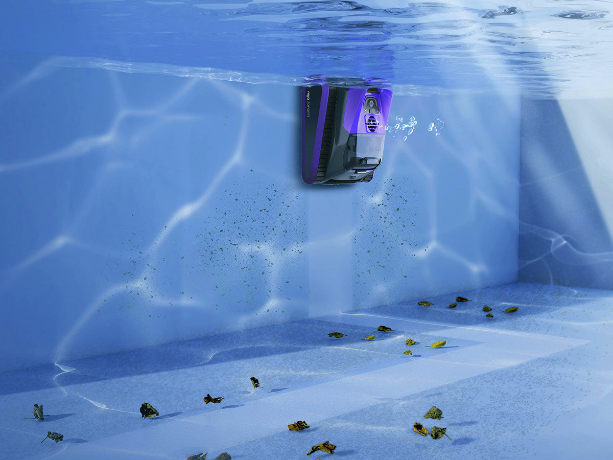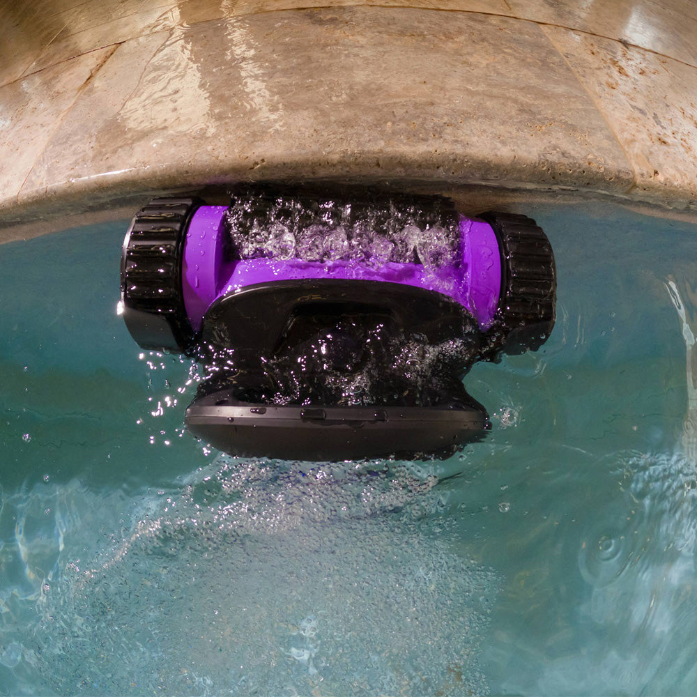 Robot pulitore subacqueo viola in azione su fondo piscina azzurro.