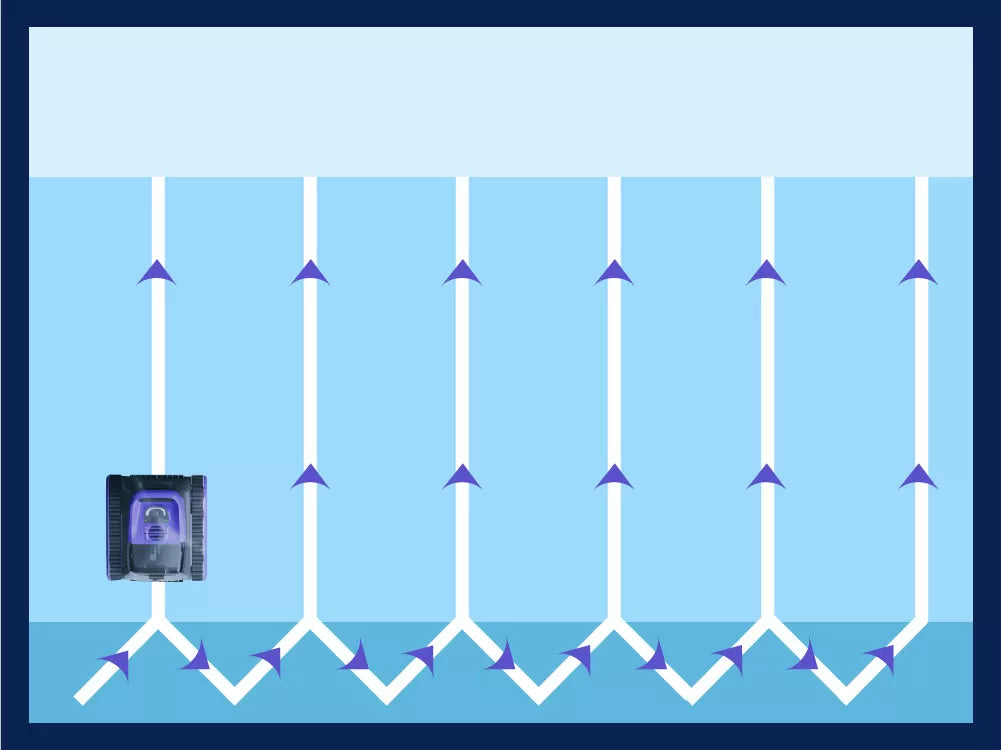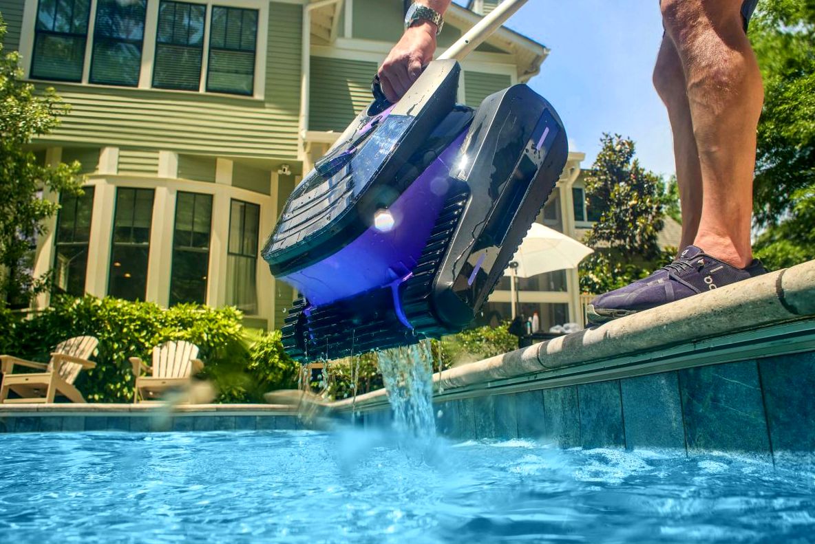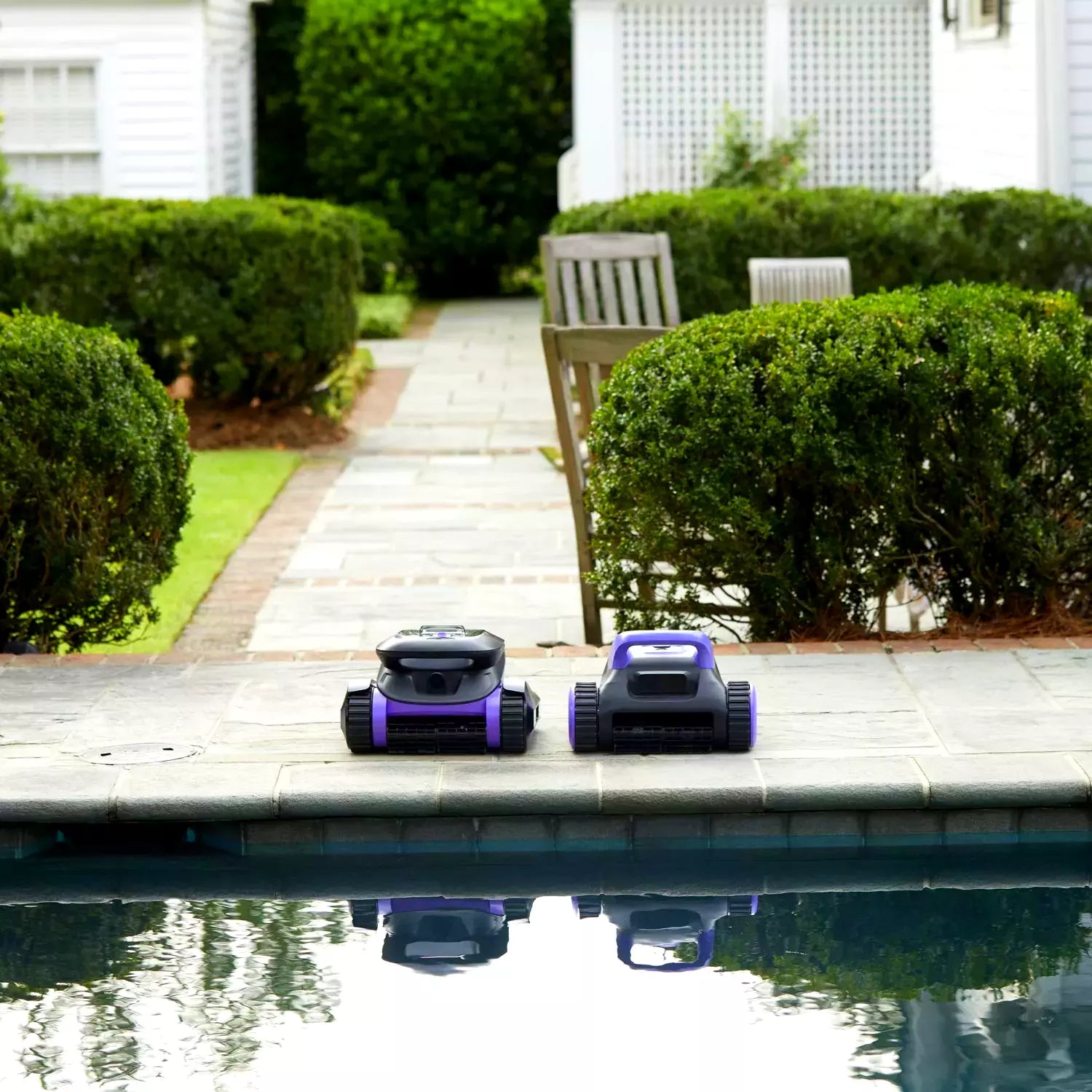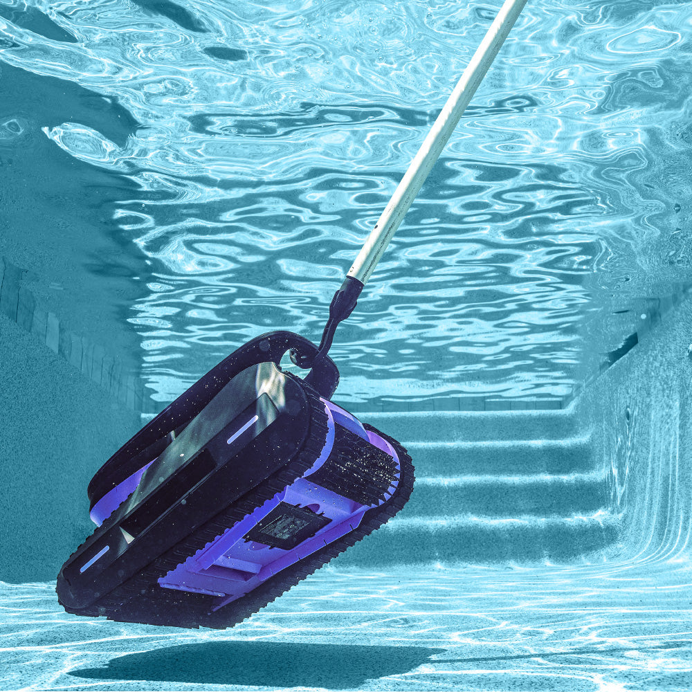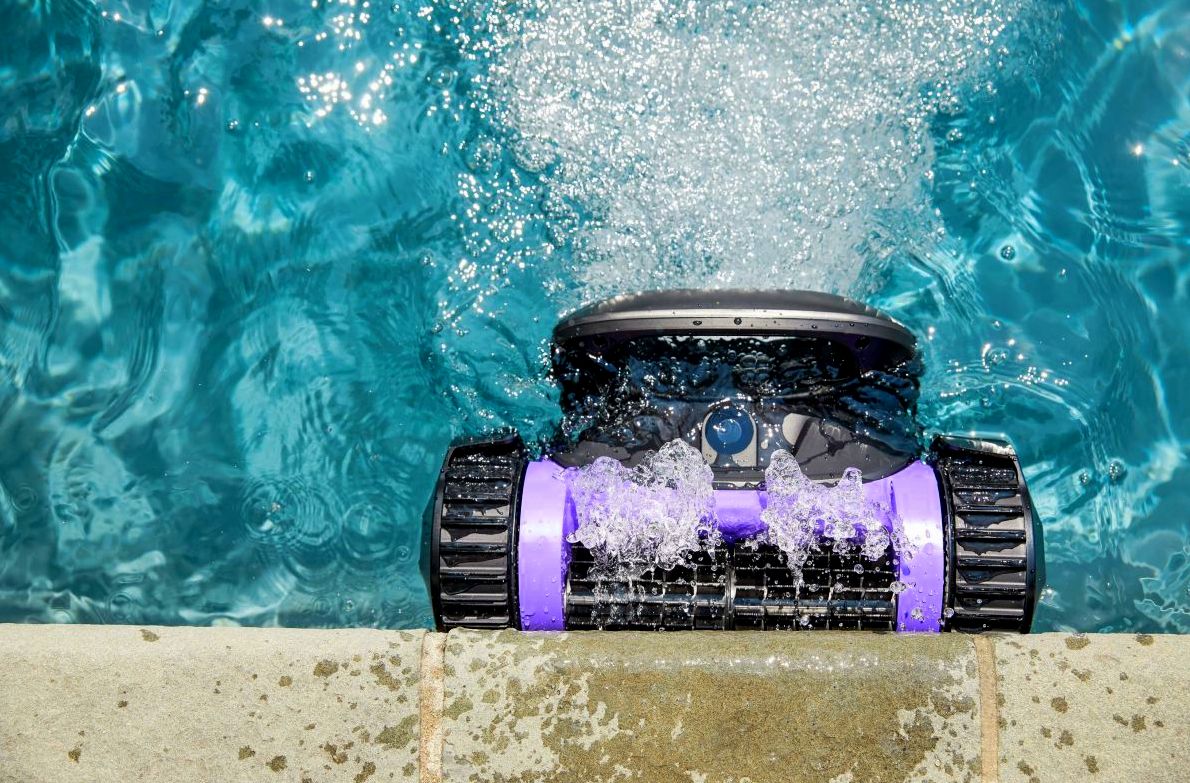 Robot pulitore subacqueo viola in azione su fondo piscina azzurro.