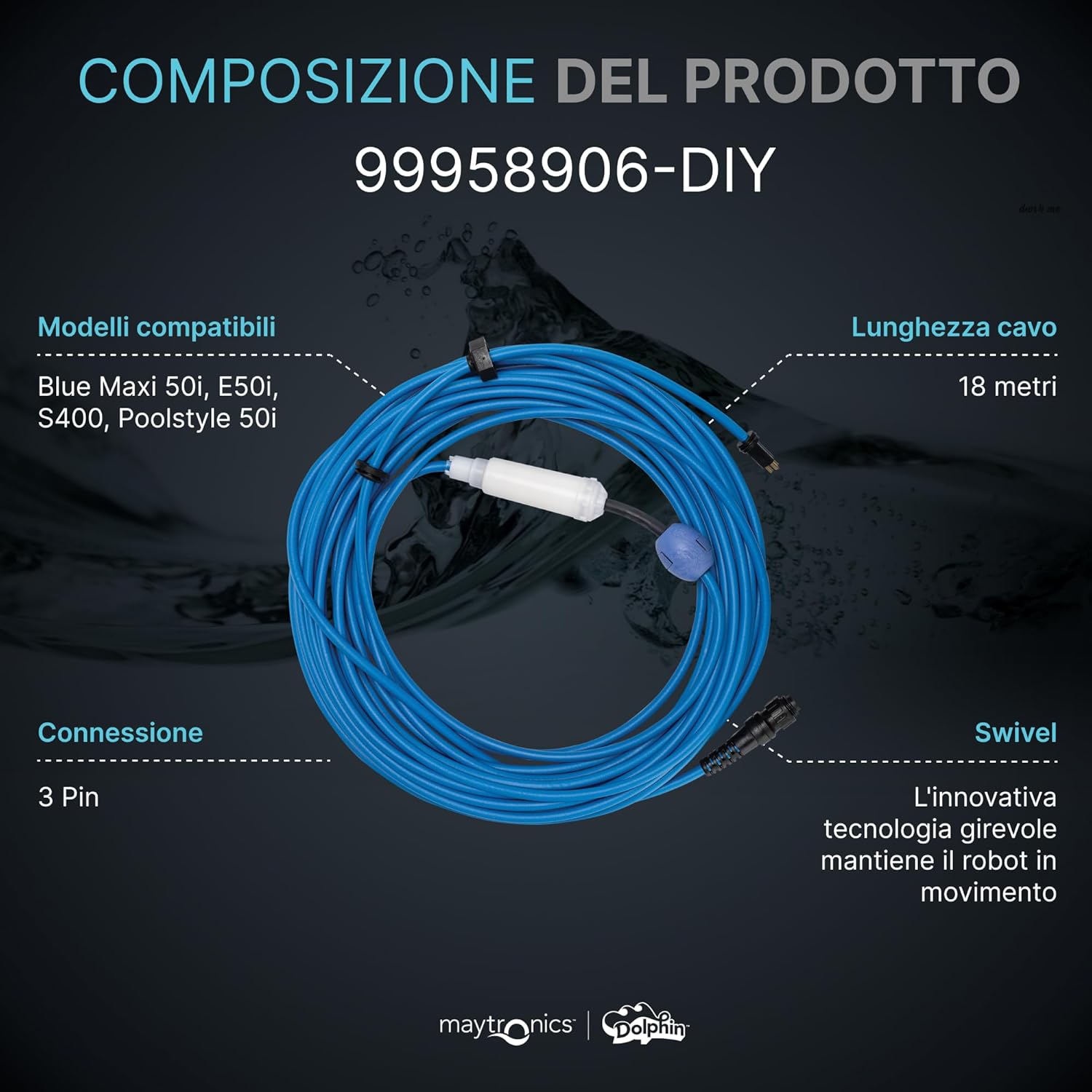 Cavo Galleggiante 18 Mt - 3 Pin – Bluetooth / WiFi con Swivel & Connettori Robot Piscina Maytronics Dolphin Z3i / S 300i – S 400i / Poolstyle 35i – 40 – 50 / SL 300i / E 35i – E 40 – E 50 / SM 40 / SX 40 / Mr 40 / 99958906-DIY
